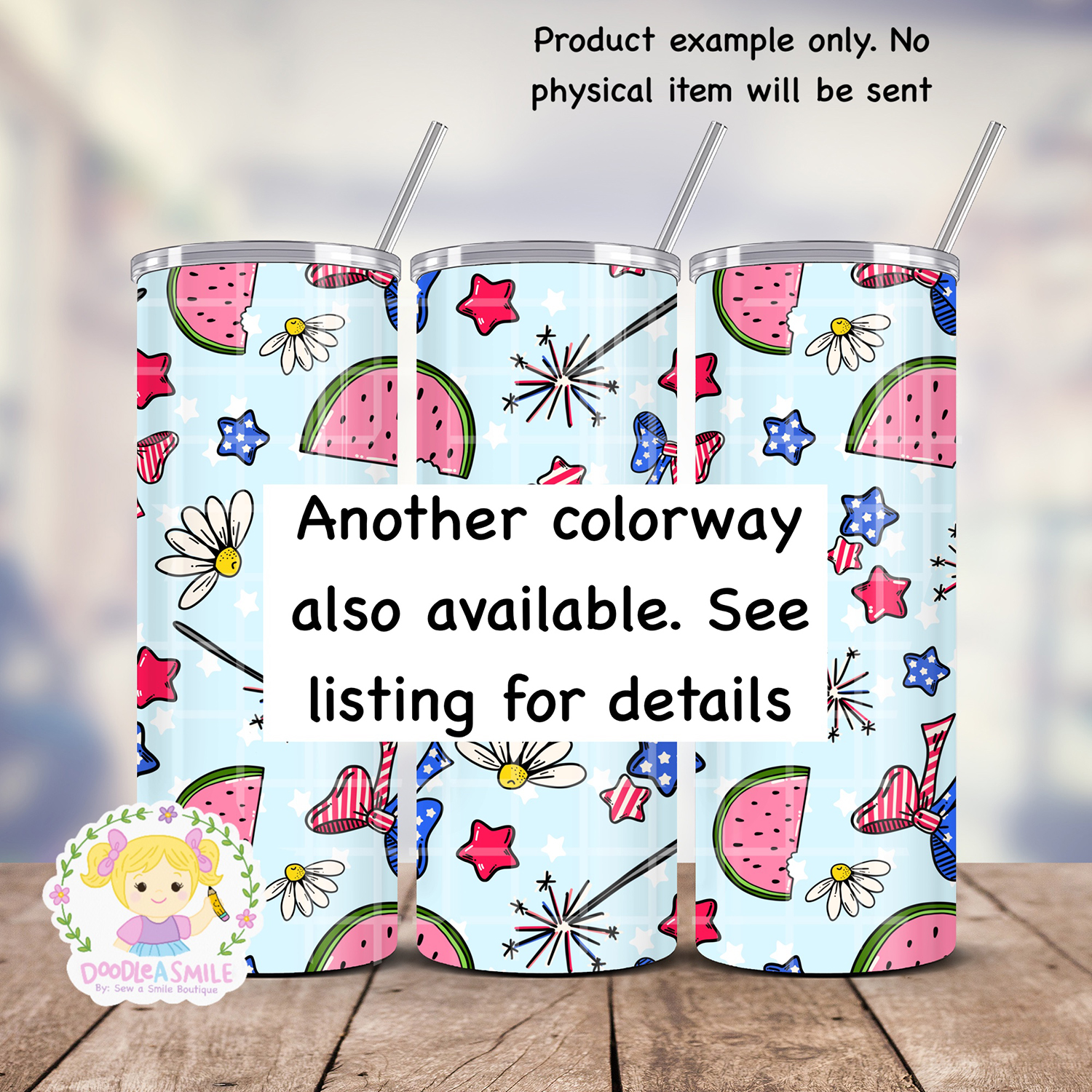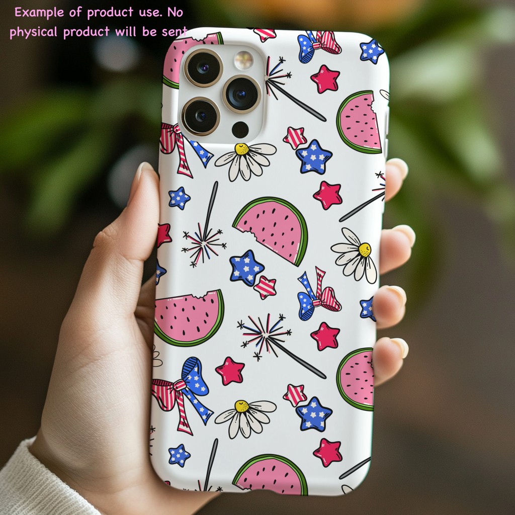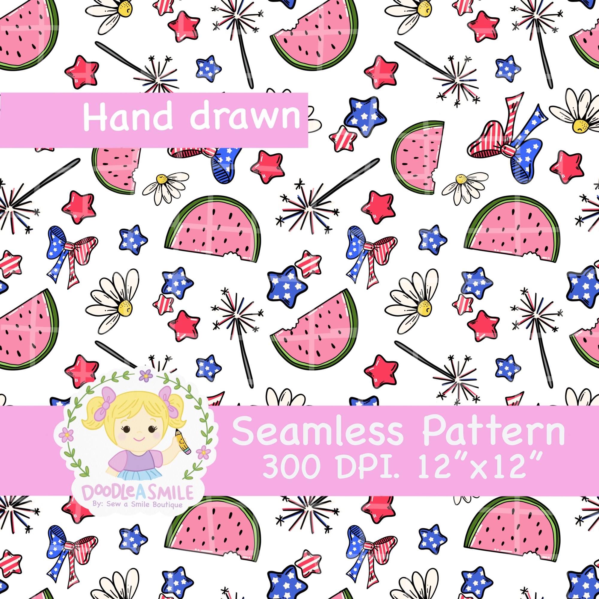 This 4th of July seamless pattern is a hand drawn design featuring cute daisy flowers, patriotic bows and watermelons in a nice repeatable pattern with a white background. This patriotic seamless PNG is perfect for fabric projects, phone cases, for sublimation and more – the options are endless!