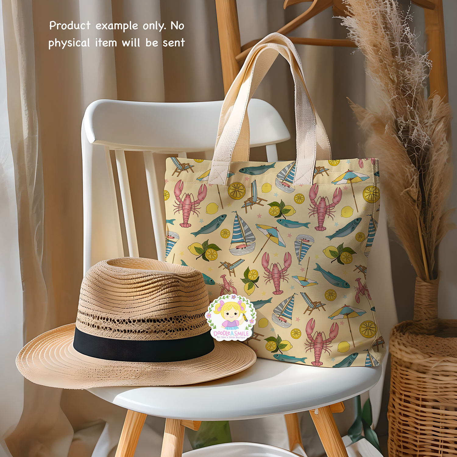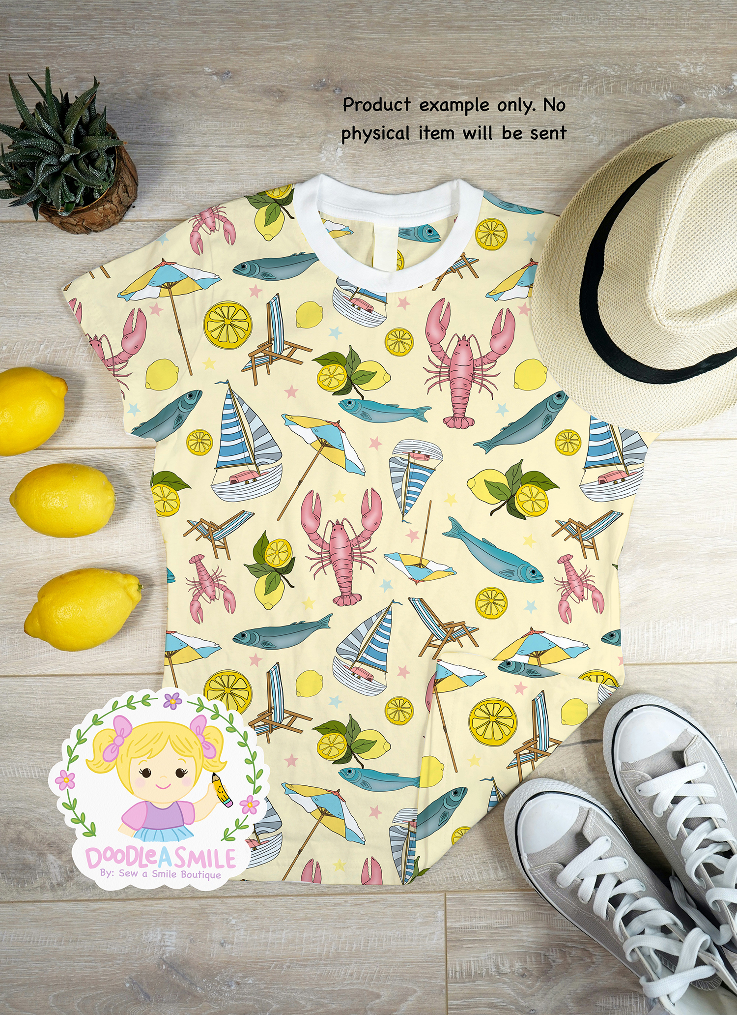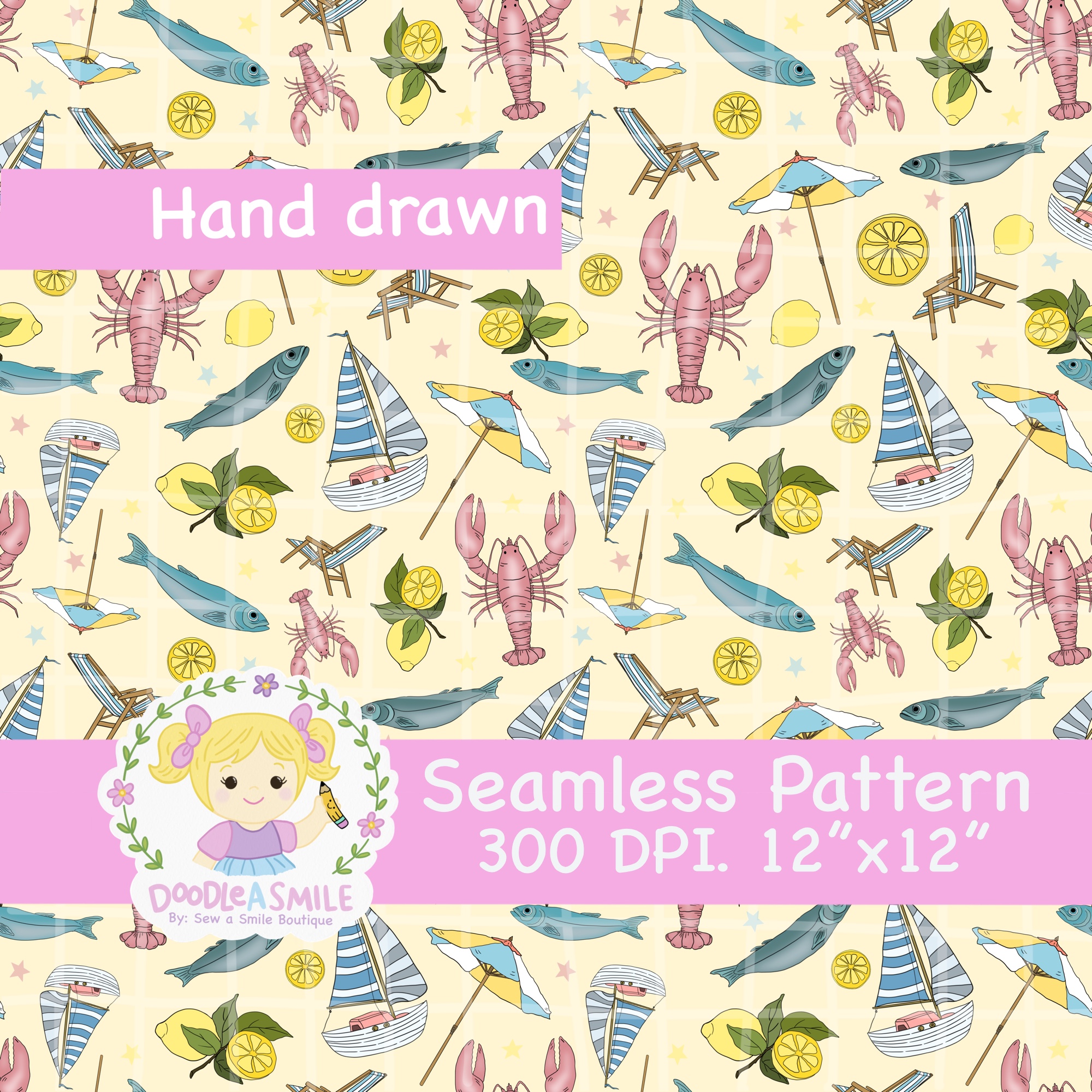 Amalfi Coast seamless pattern is a hand drawn design featuring cute pastel motifs including lobster, umbrella, sailboats, sardines and lemons. This pattern is perfect for fabric projects, stationary, scrapbooks, and more – the possibilities are endless!