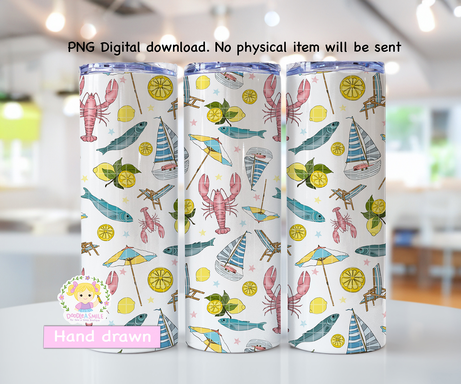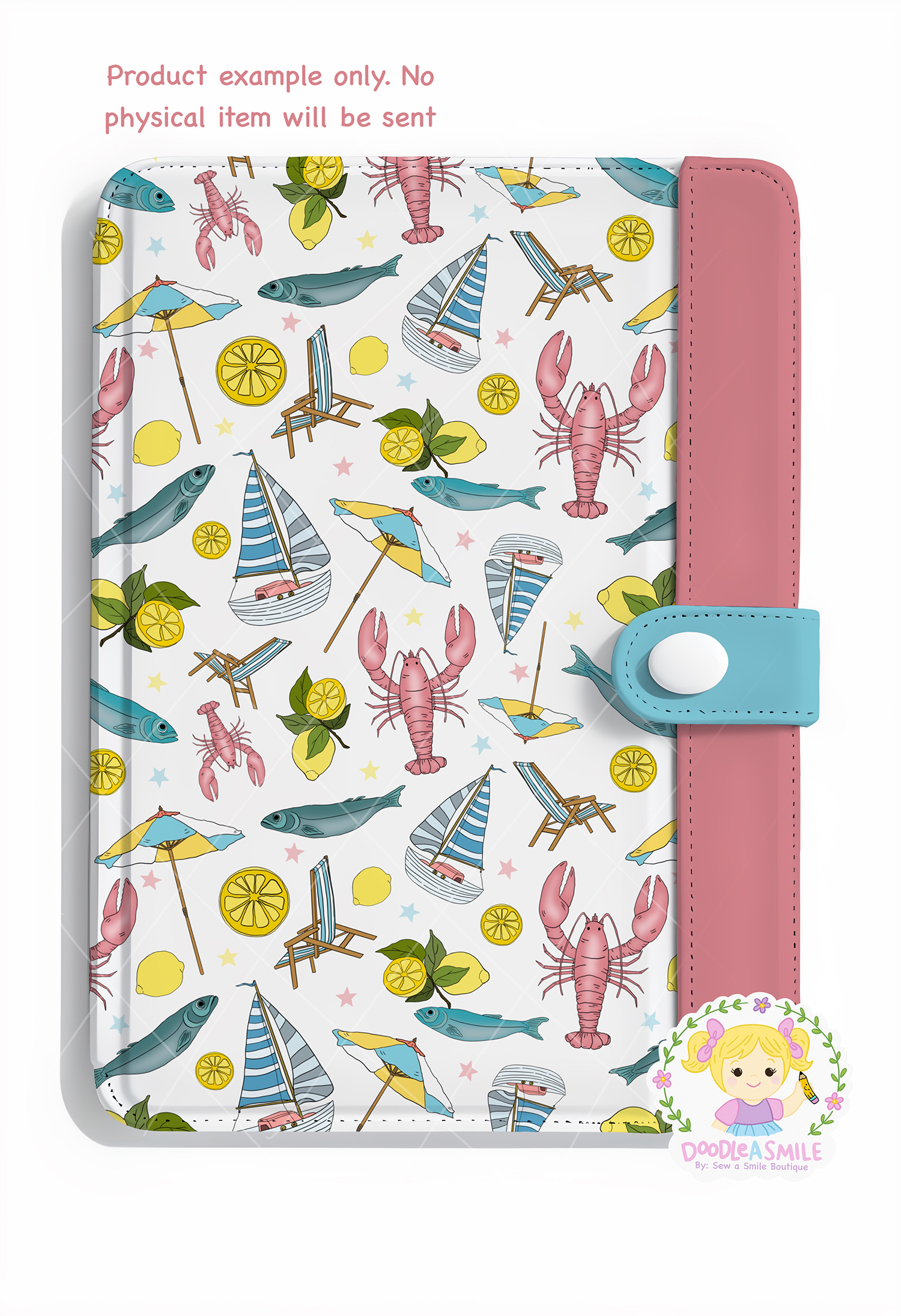 THIS IS NOT A PHYSICAL ITEM Amalfi Coast seamless pattern is a hand drawn design featuring cute pastel motifs including lobster, umbrella, sailboats, sardines and lemons. This pattern is perfect for fabric projects, stationary, scrapbooks, and more – the possibilities are endless!