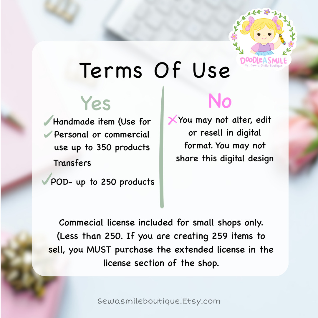 πΌ TERMS OF USE Commercial license included for small shops (up to 250 physical items). β You MAY use this design for: β’ Handmade items (personal or commercial) β’ Sublimation & transfers β’ Print-on-demand products