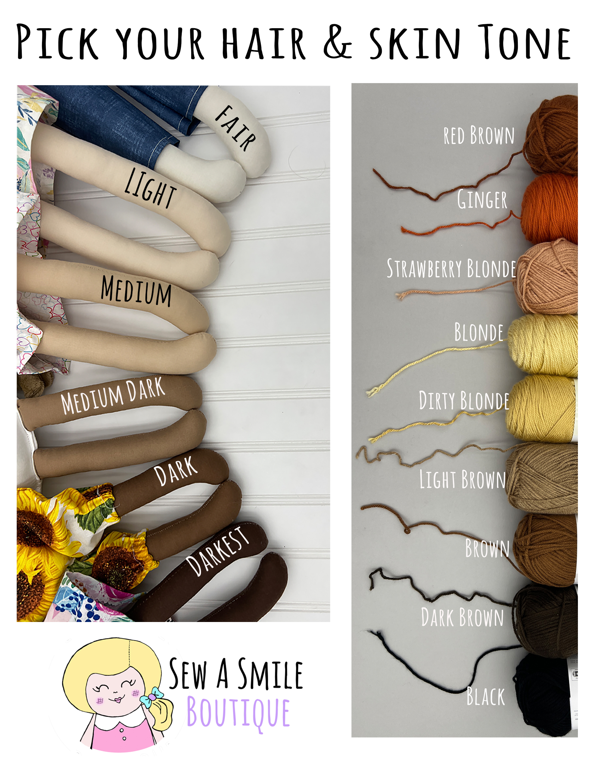 Order includes (1)15″ or (1) 18″ doll with yarn hair and one outfit (skirt, pants, dress, romper) customized by you. Additional doll accessories are available.